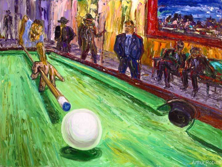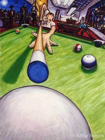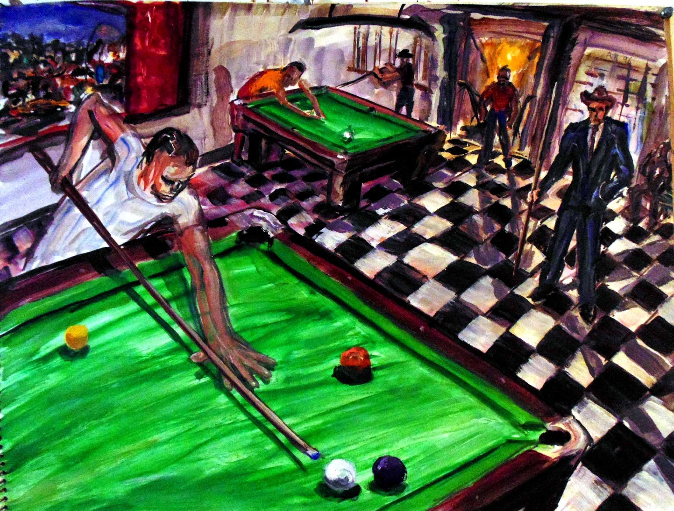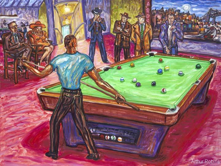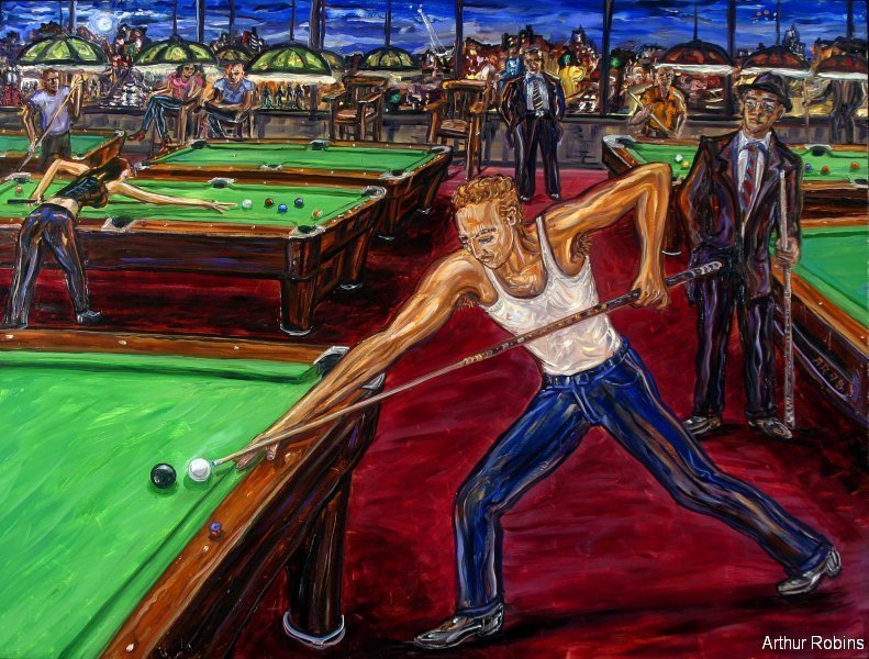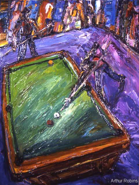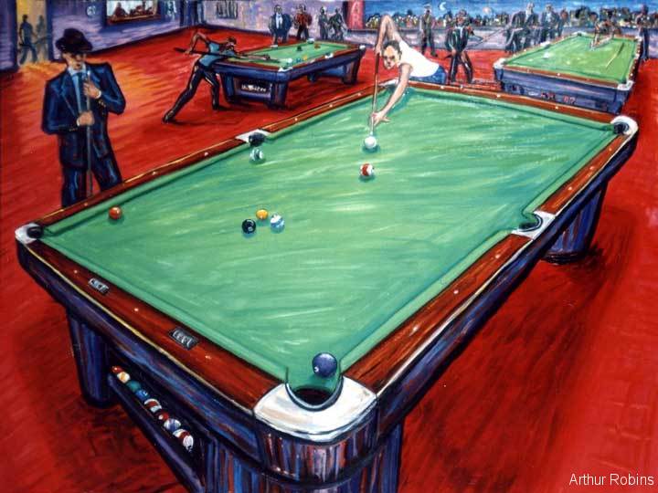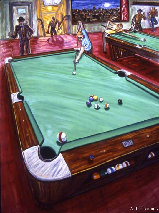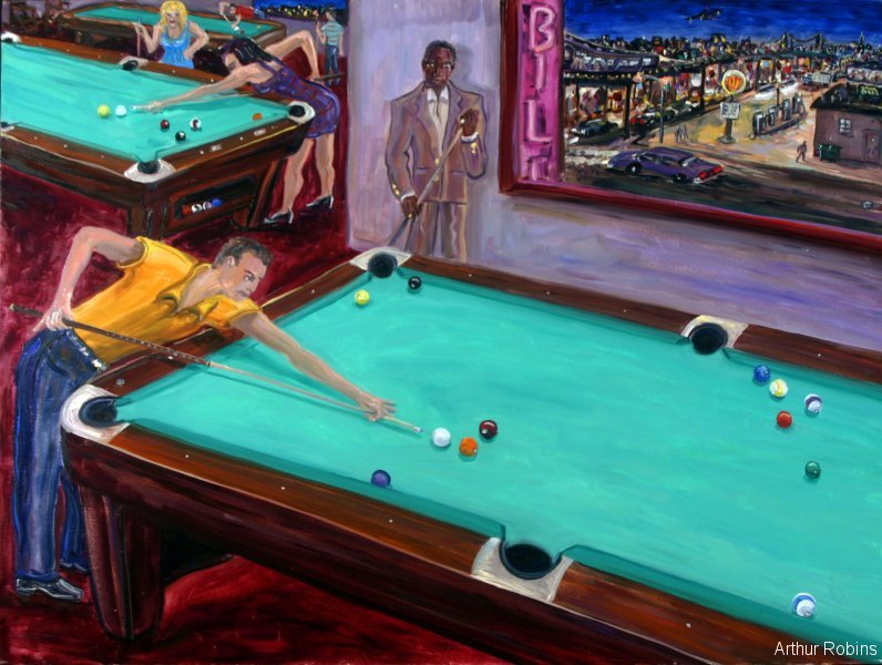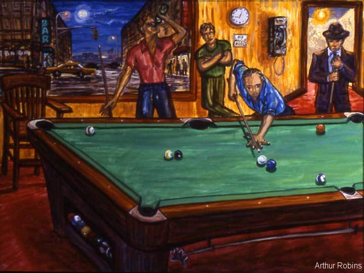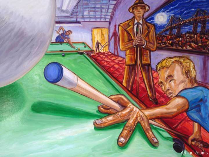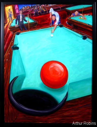 POOL AND BILLIARD PAINTINGS. These Pool paintings and Billiard Paintings are made from small drawings i did from imagination or actual Pool Halls. My subject is more than Pool Tables, Cue Sticks and Pool Shooters. While these are colorful things, my ideas behind these paintings involve many other things, including good and evil our culture, and the nature of reality itself. My pool paintings have been shown in many galleries and Museums, and my pool prints and paintings are cherished by collectors around the world.