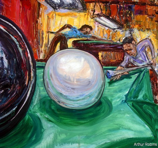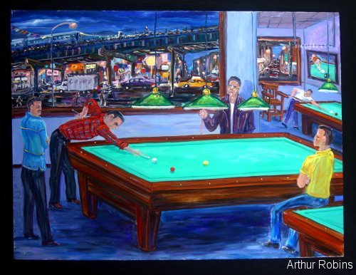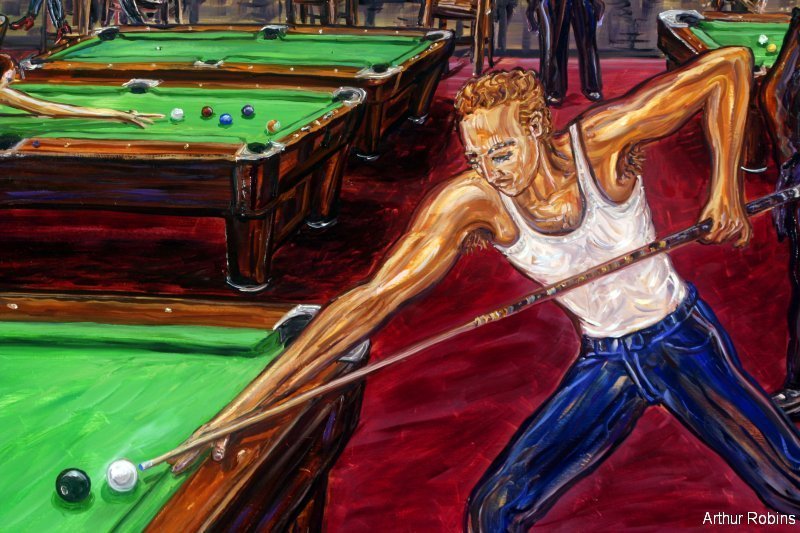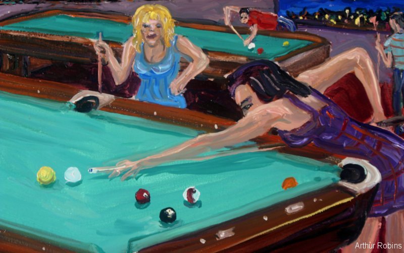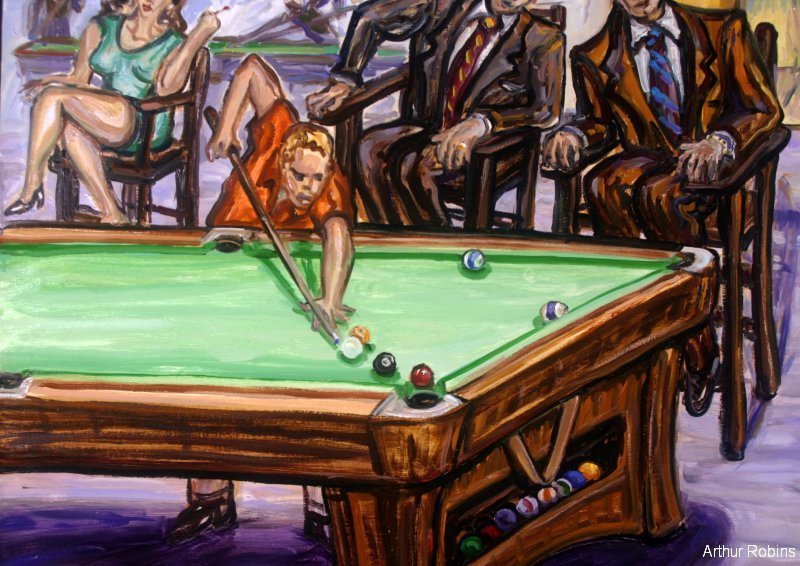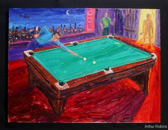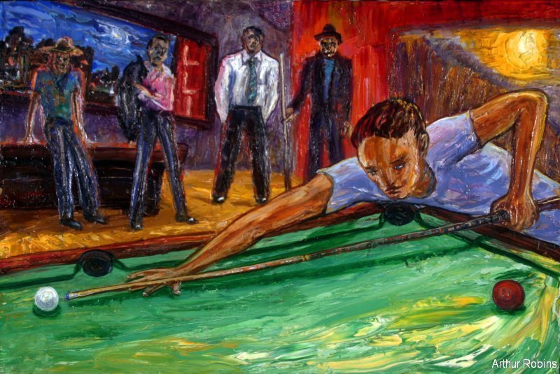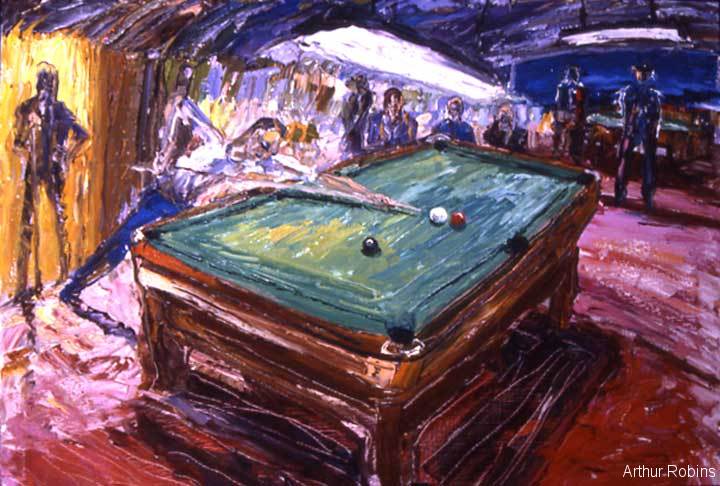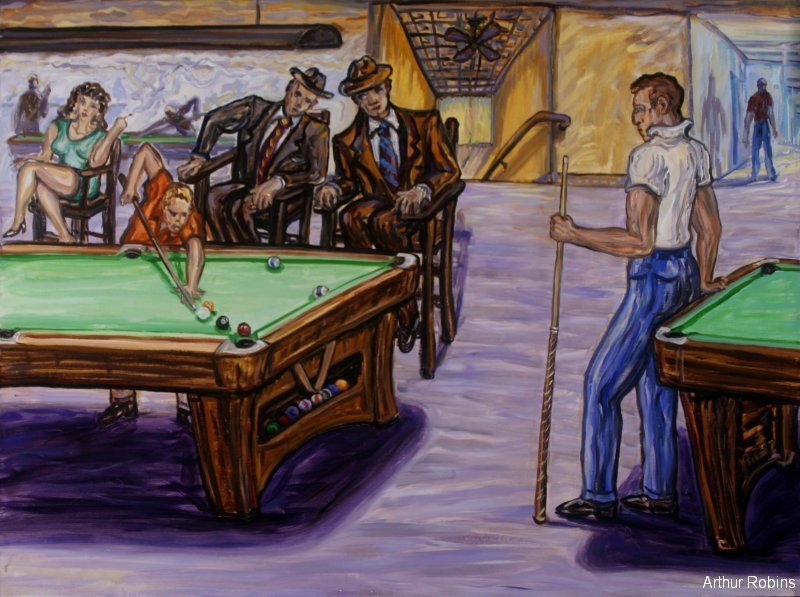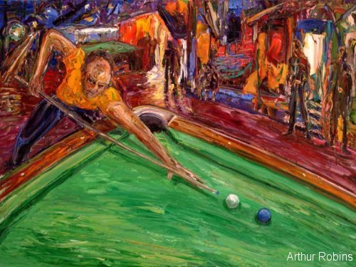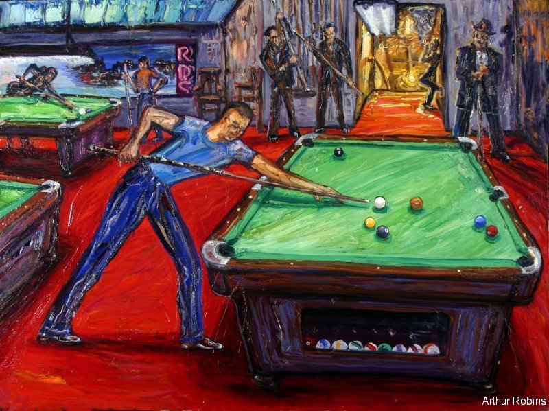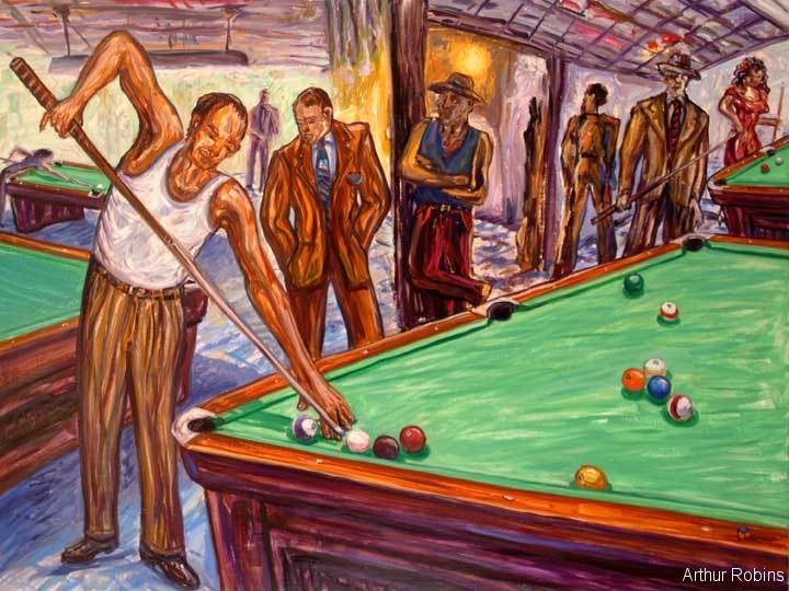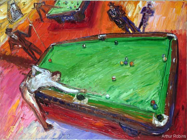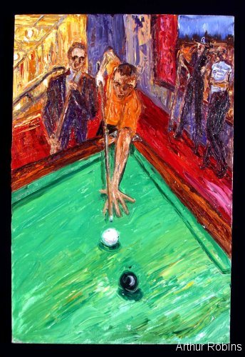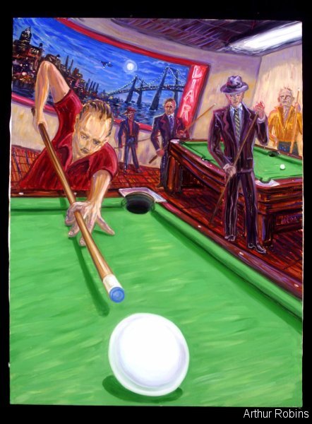POOL AND BILLIARD PAINTINGS. These Pool paintings and Billiard Paintings are made from small drawings i did from imagination or actual Pool Halls. My subject is more than Pool Tables, Cue Sticks and Pool Shooters. While these are colorful things, my ideas behind these paintings involve many other things, including good and evil our culture, and the nature of reality itself. My pool paintings have been shown in many galleries and Museums, and my pool prints and paintings are cherished by collectors around the world.