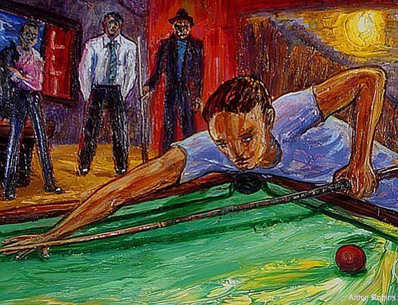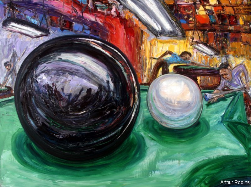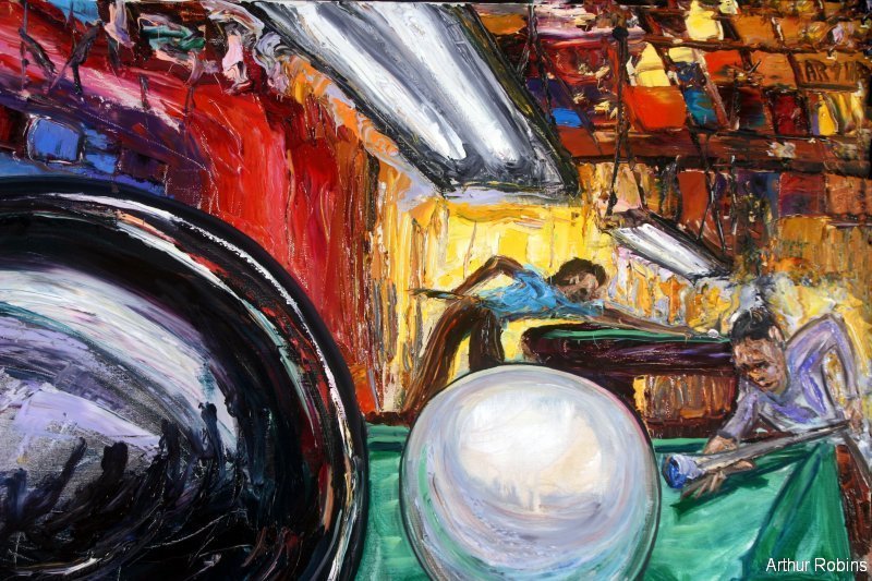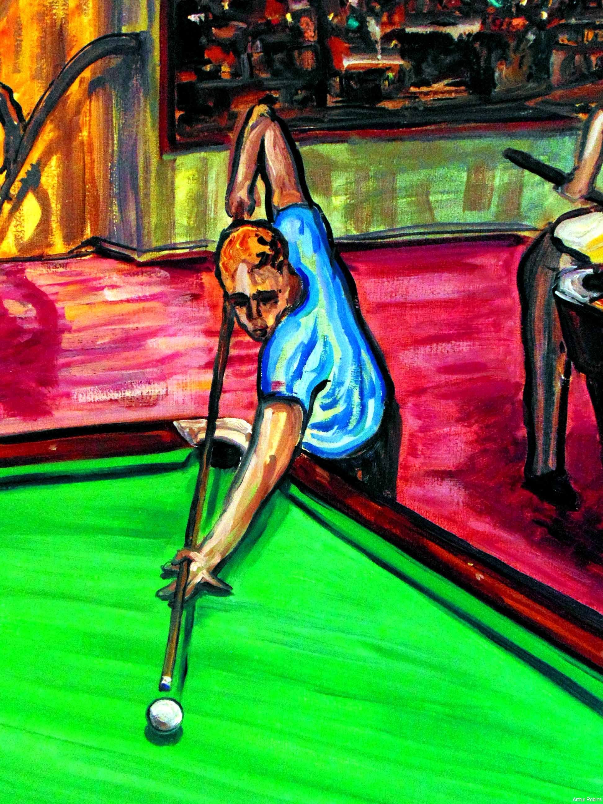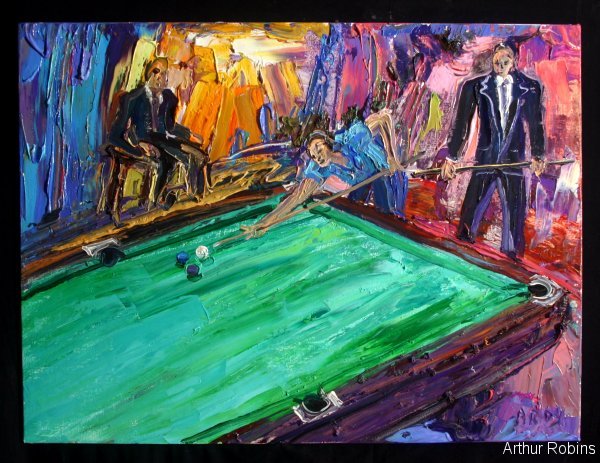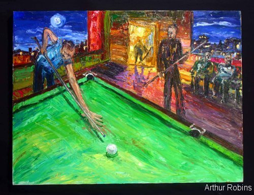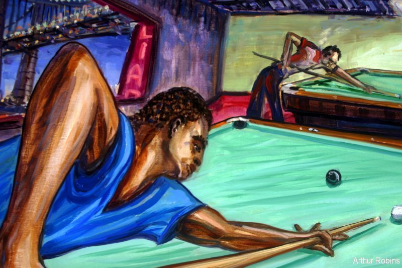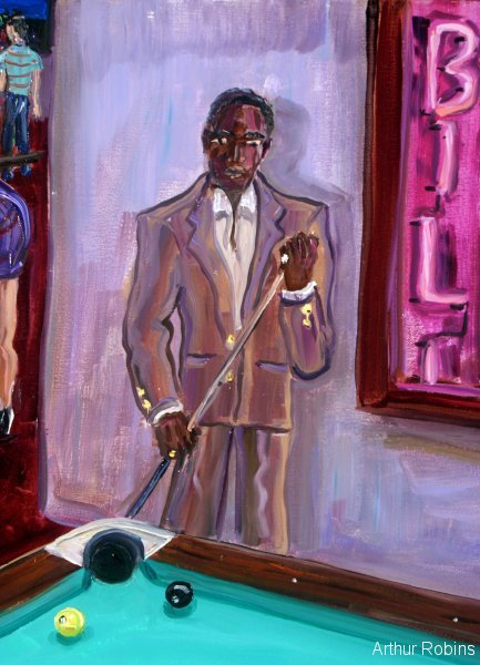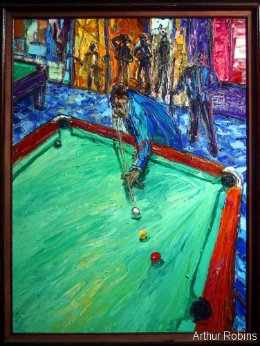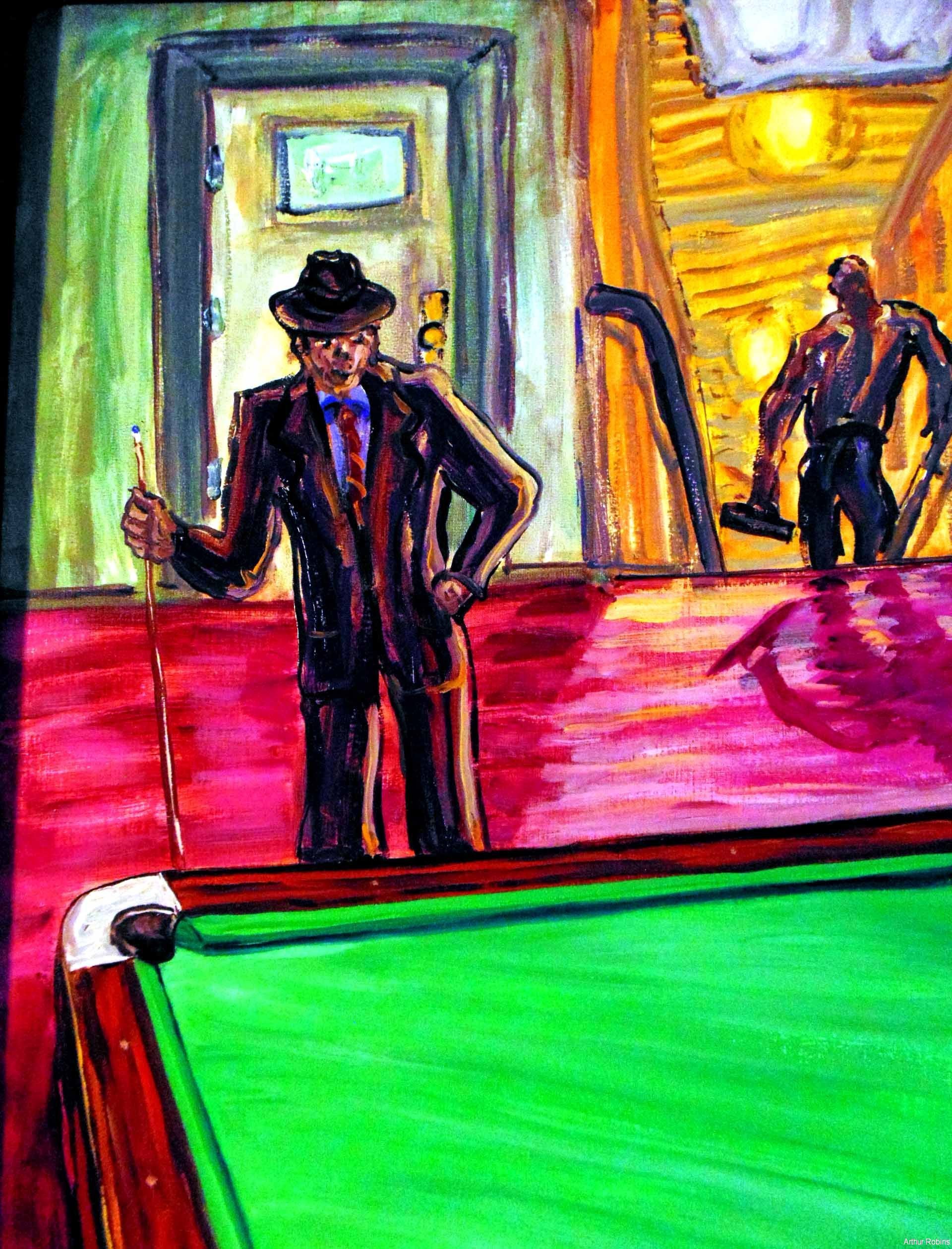 POOL AND BILLIARD PAINTINGS. These Pool paintings and Billiard Paintings are made from small drawings i did from imagination or actual Pool Halls. My subject is more than Pool Tables, Cue Sticks and Pool Shooters. While these are colorful things, my ideas behind these paintings involve many other things, including good and evil our culture, and the nature of reality itself. My pool paintings have been shown in many galleries and Museums, and my pool prints and paintings are cherished by collectors around the world.