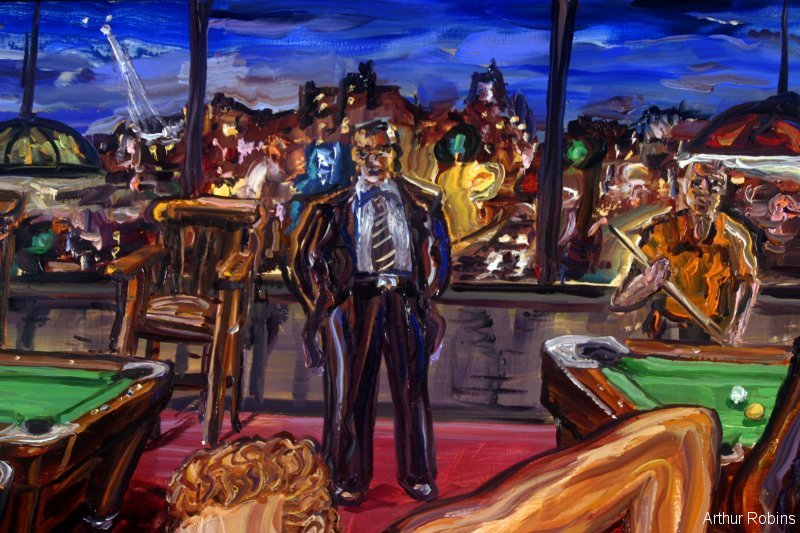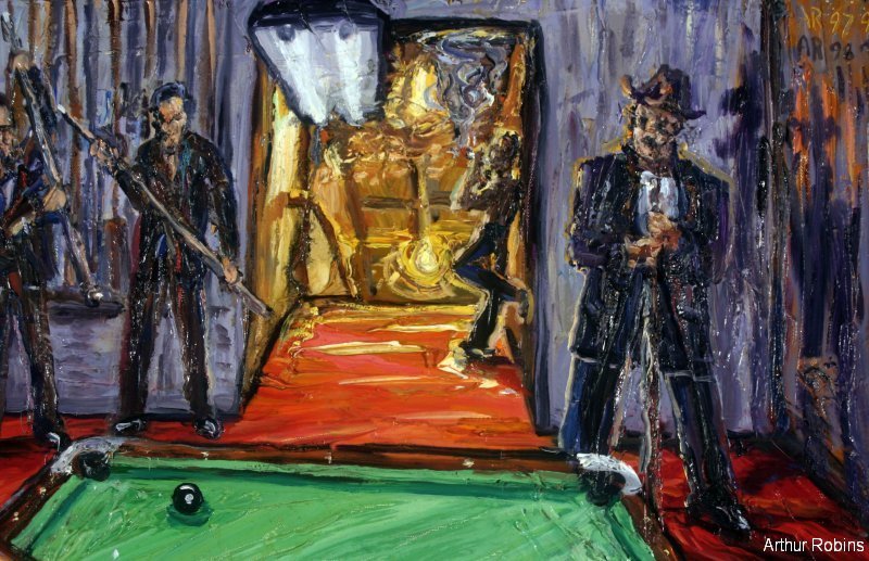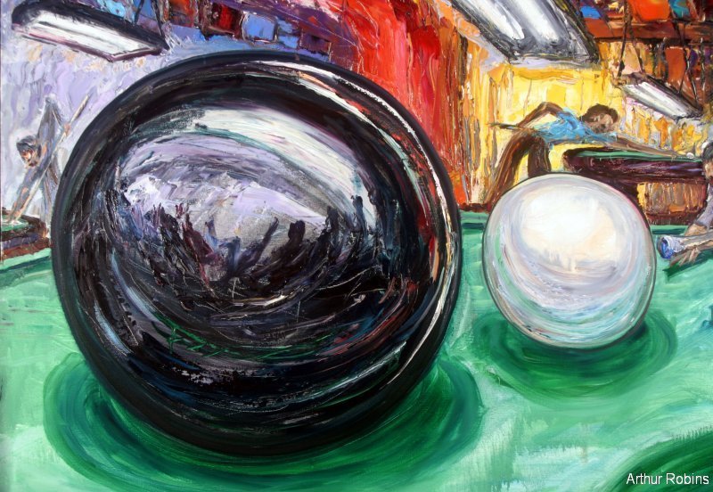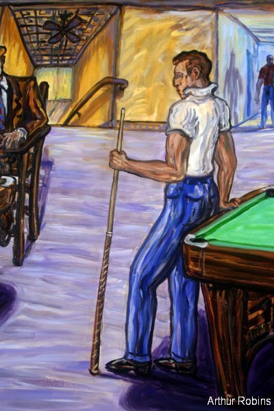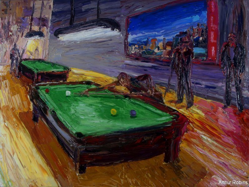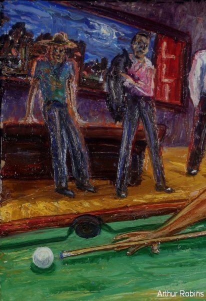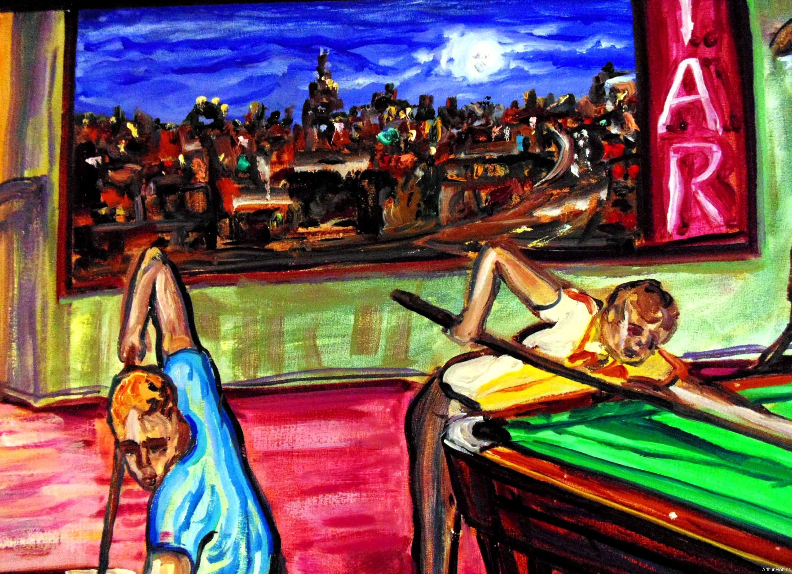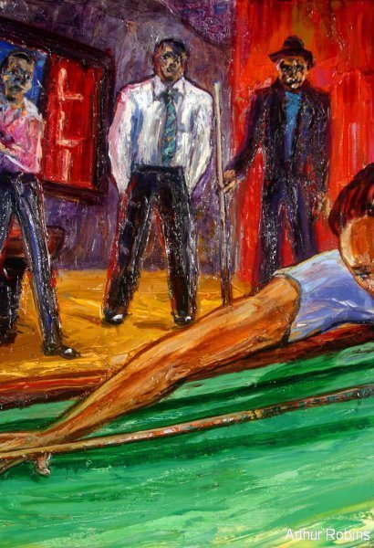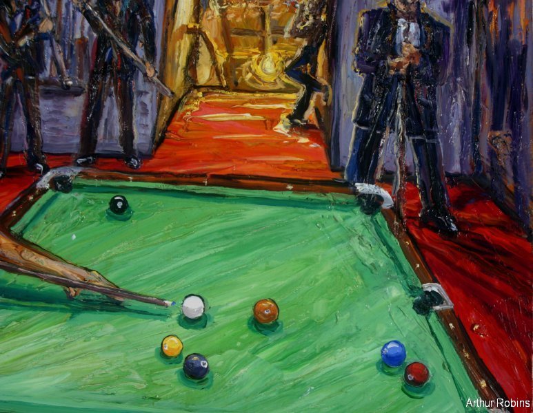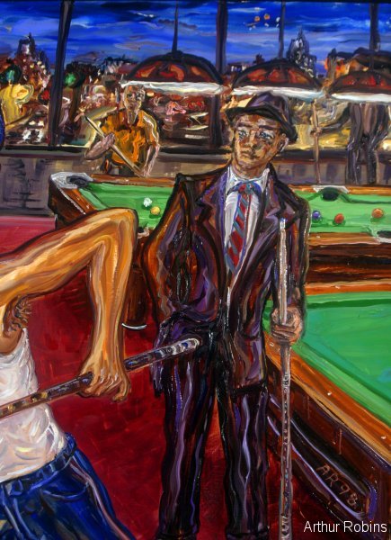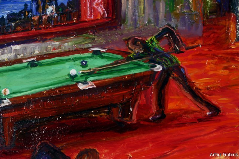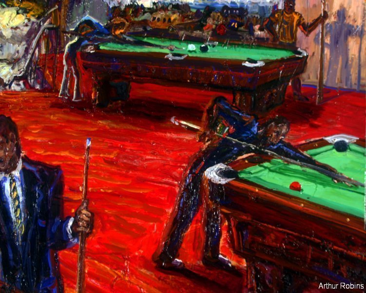 POOL AND BILLIARD PAINTINGS. These Pool paintings and Billiard Paintings are made from small drawings i did from imagination or actual Pool Halls. My subject is more than Pool Tables, Cue Sticks and Pool Shooters. While these are colorful things, my ideas behind these paintings involve many other things, including good and evil our culture, and the nature of reality itself. My pool paintings have been shown in many galleries and Museums, and my pool prints and paintings are cherished by collectors around the world.