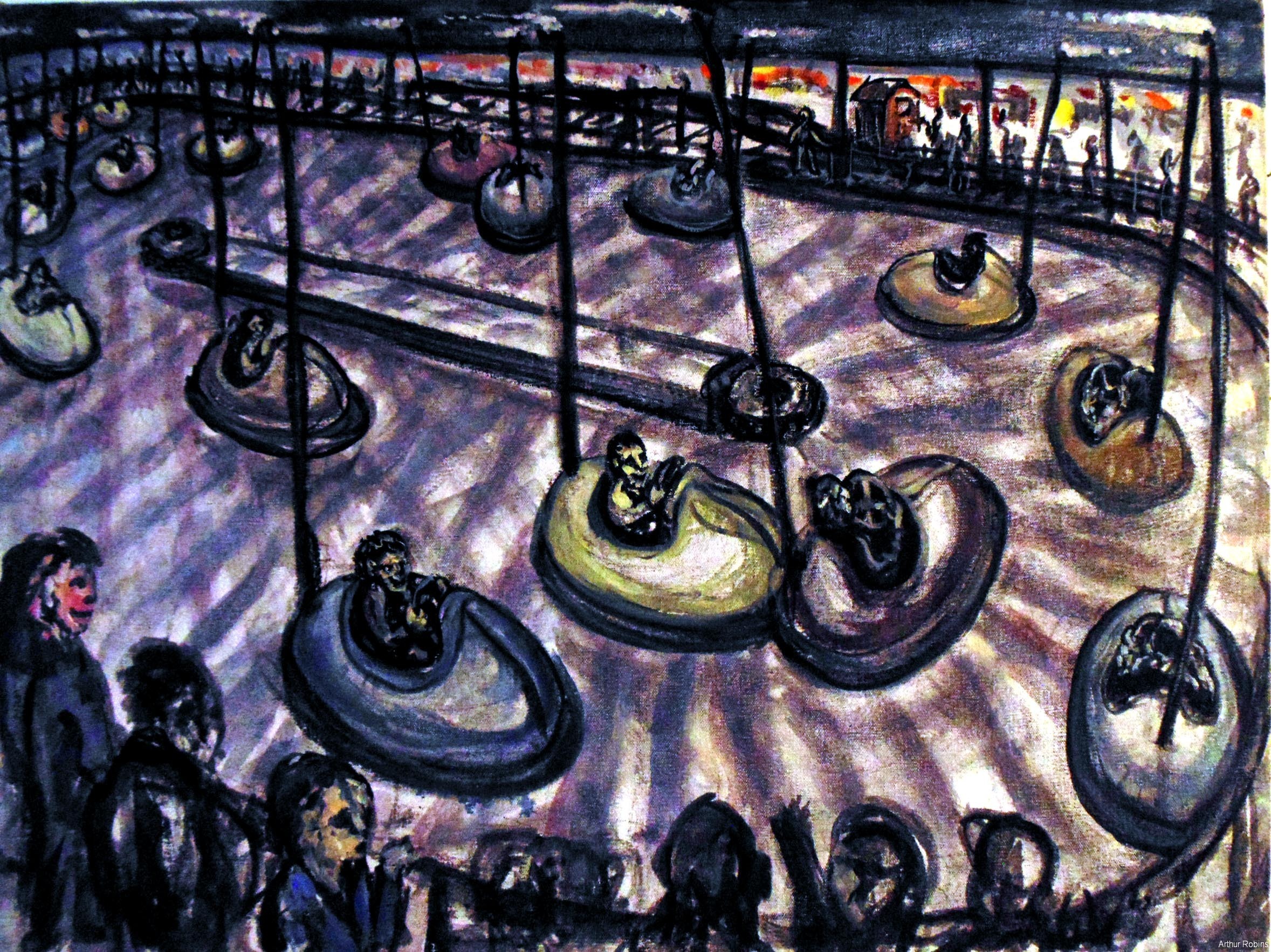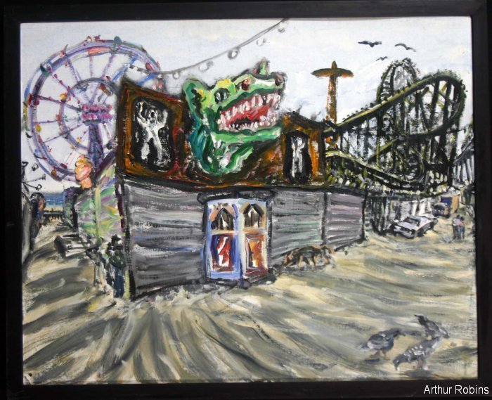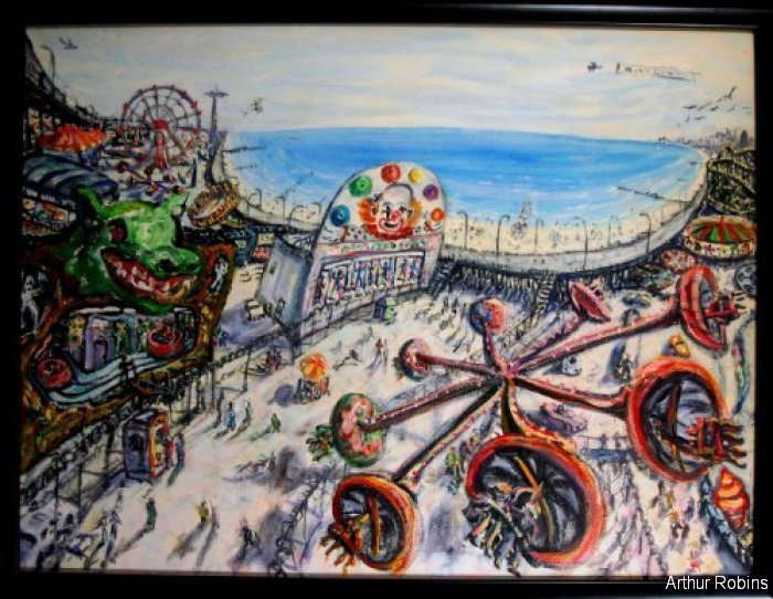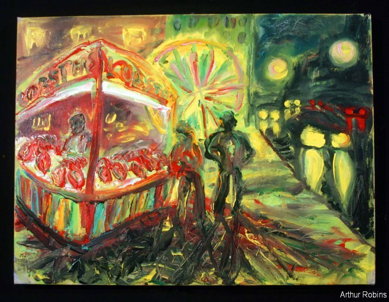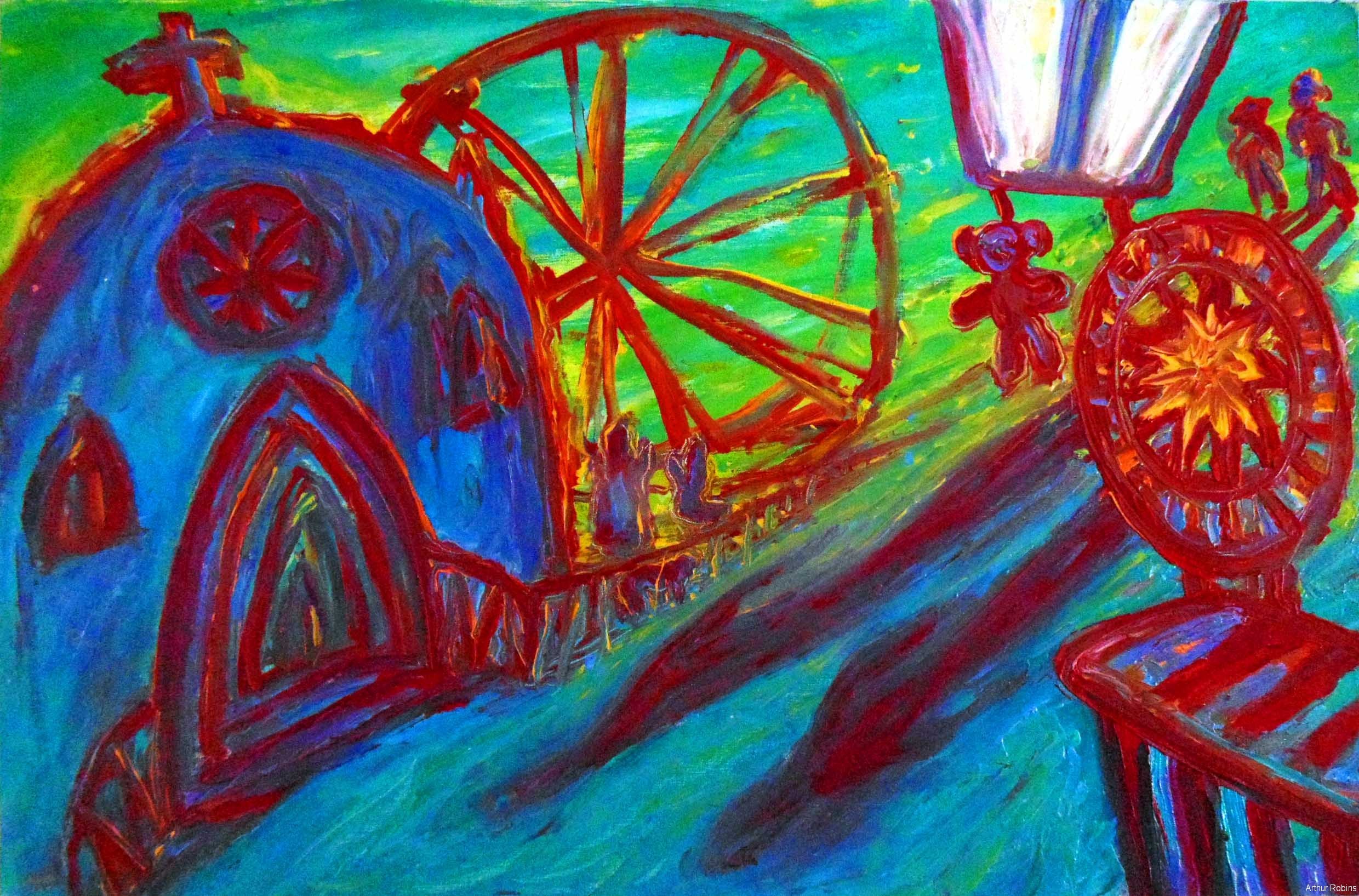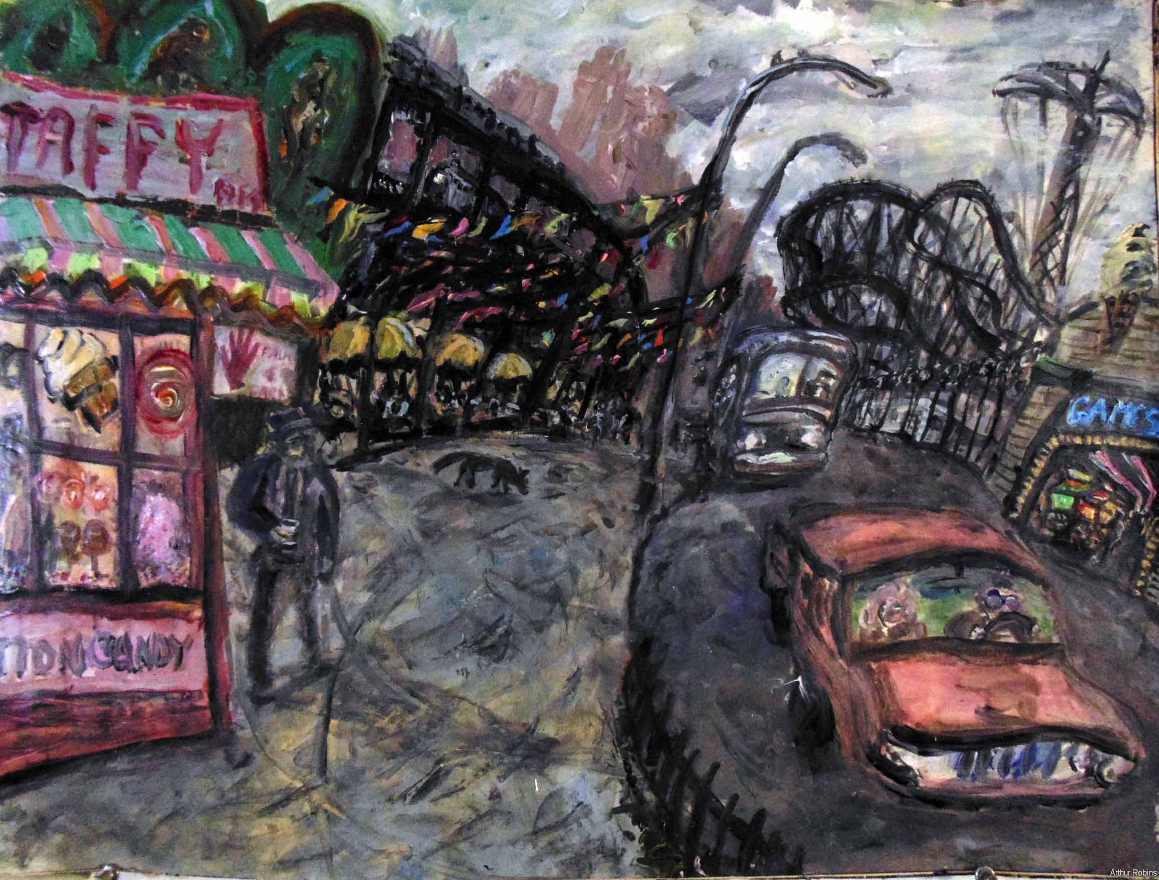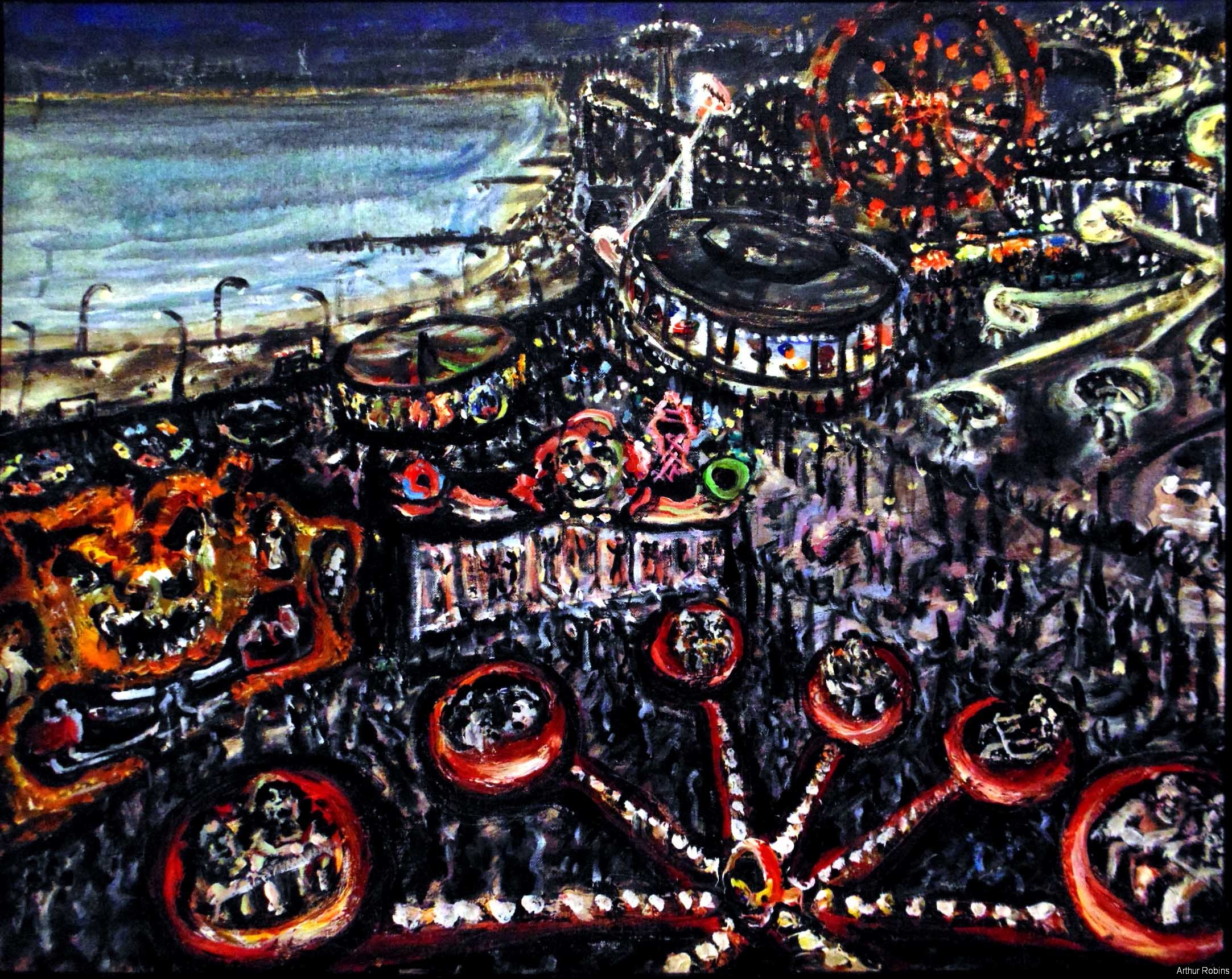 CARNIVALS. These paintings are inspired by, Coney Island, The Feast of San Genarro, The Circus, Street Carnivals, and other festive gatherings where such things exist. The images of Merry Go Rounds, Roller Coasters, Spooky rides, Tilt-a whirls, Bumping cars, reside in our mass subconsciousness. Combined with hot dogs, French fries, cotton candy, ice cream, ferris wheels, and gangsters, the carnival images are a surreal backdrop to Americana and the culture which it springs from.